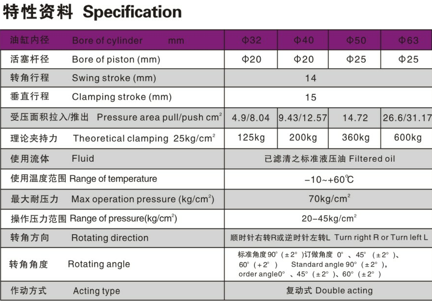 本产品有缸径从&32-&63四种,为复动式,标准转角缸角度是90°,可选择角度是0°、45°、60°。