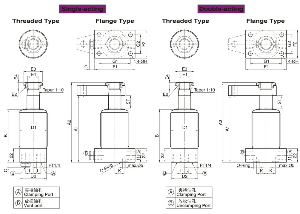 此型式油缸适用于夹持工件取放空间需保持静空,方便工件取放及高压夹持。