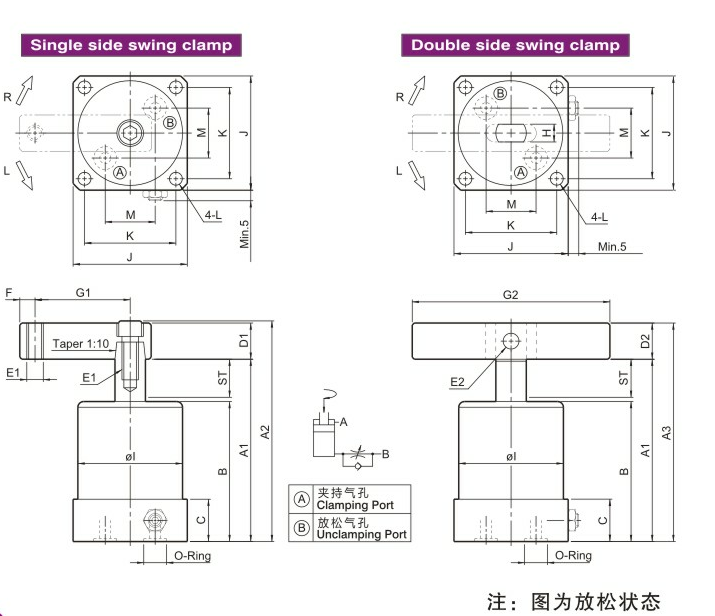 建议使用空压转角缸,A.B入气口请加装流量控制阀,避免速度过快,以及转角行程中,请勿夹持工件,导致损坏缸体及内部零件。
